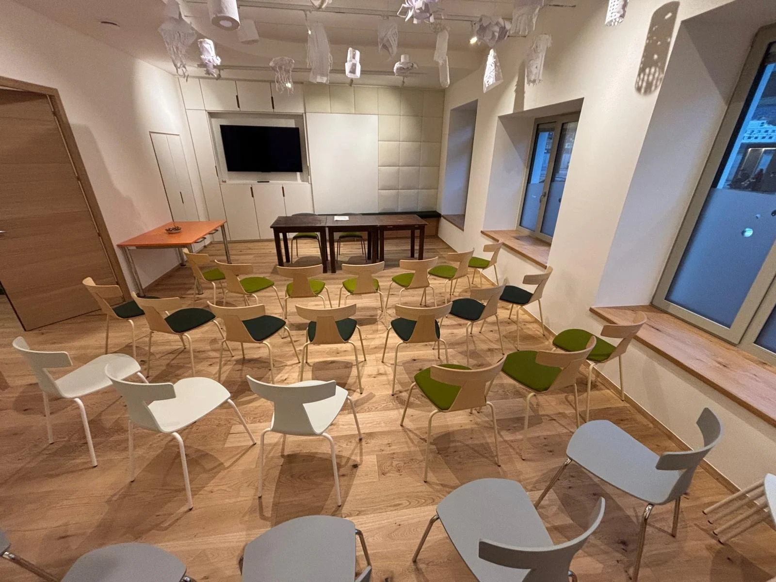 dormiHUB è uno spazio aperto per incontro, cultura e formazione. È accessibile sia agli inquilini e le inquiline della casa, sia a iniziative, associazioni e imprese: qui si svolgono letture, mostre, workshop o pasti condivisi. Uno schermo, Wi-Fi, tavoli flessibili e fino a 35 posti a sedere su 42 m² consentono un utilizzo versatile. Anche il giardino dietro la casa viene aperto quando necessario. DormiHUB vive di scambio e partecipazione, collega la casa alla città. E lo spazio dimostra: l’integrazione riesce là dove le persone si incontrano e creano insieme qualcosa di nuovo. Lo spazio dormiHUB può essere utilizzato da chiunque sia interessato/a, a fronte di una donazione.
